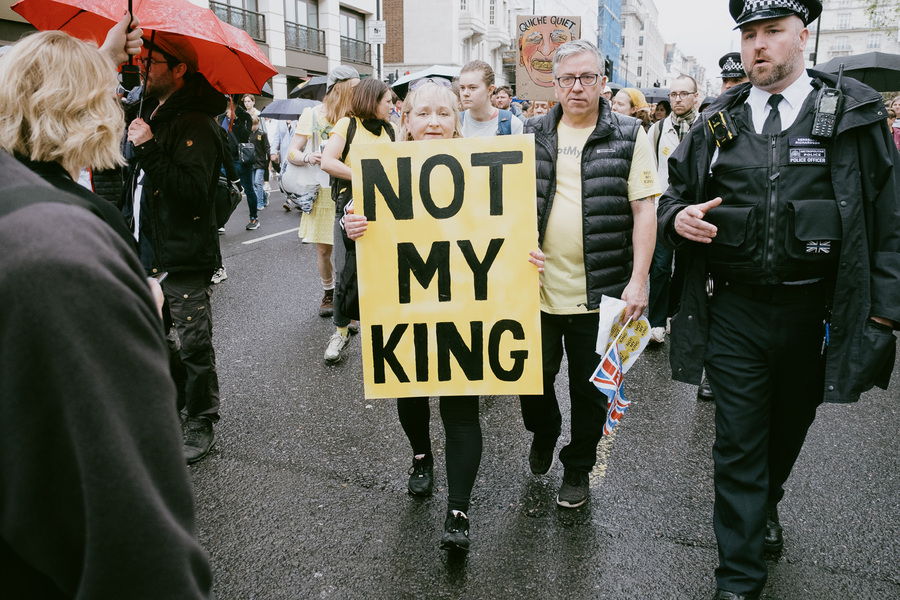 Crowds assemble in central London to watch the crowning of a new king.